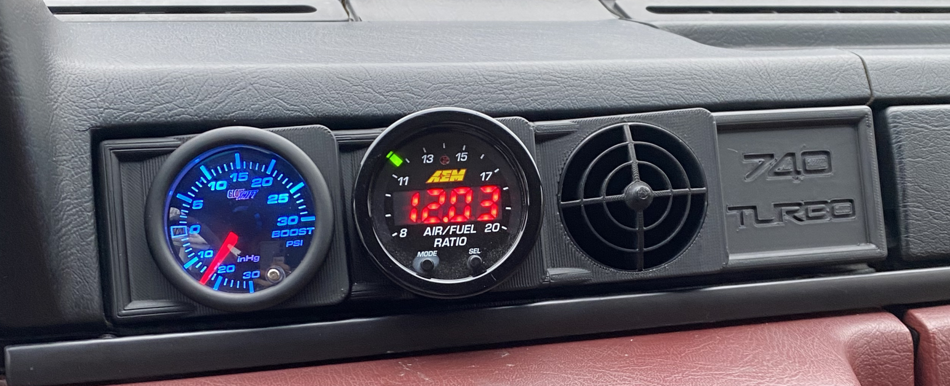 Tämä paneeli korvaa tehtaan kojelaudan tuuletusaukon sisäkkeen ja mahdollistaa 52 mm:n jälkimarkkinamittareiden asentamisen säilyttäen samalla puhtaan OEM-tyylisen ulkonäön. Lisävarusteena on saatavilla kohokuvioitu "740 Turbo" -sivupaneeli tehdastyyliseen ulkonäköön.